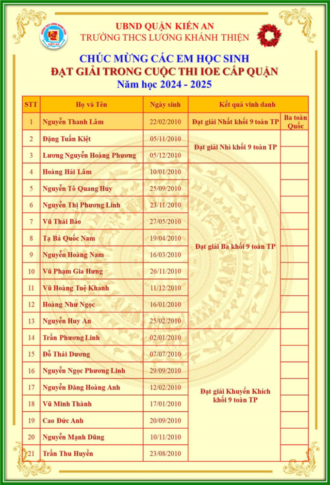 Khối 9: 01 Nhất, 02 Nhì, 10 Ba, 08 Khuyến khích